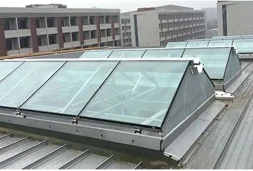 三角型通風天窗包括窗框、采光材料、窗扇、電動推拉桿、控制箱幾個部分。其中窗框多選用鋁合金材質,采光材料一般選用透光性強的陽光板或者FRP采光板。這種材料在保證足夠通風的情況下,還能有效排除積水、抵抗強風。