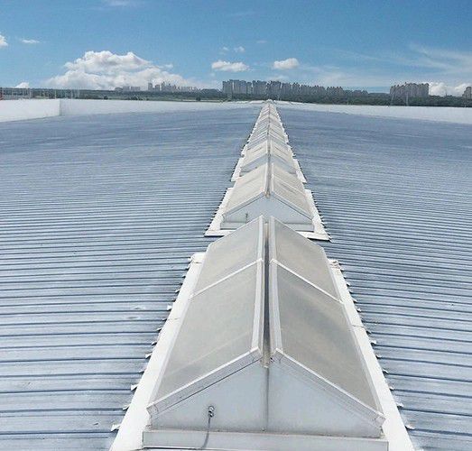 三角型通風(fēng)天窗包括窗框、采光材料、窗扇、電動(dòng)推拉桿、控制箱幾個(gè)部分。其中窗框多選用鋁合金材質(zhì),采光材料一般選用透光性強(qiáng)的陽光板或者FRP采光板。這種材料在保證足夠通風(fēng)的情況下,還能有效排除積水、抵抗強(qiáng)風(fēng)。